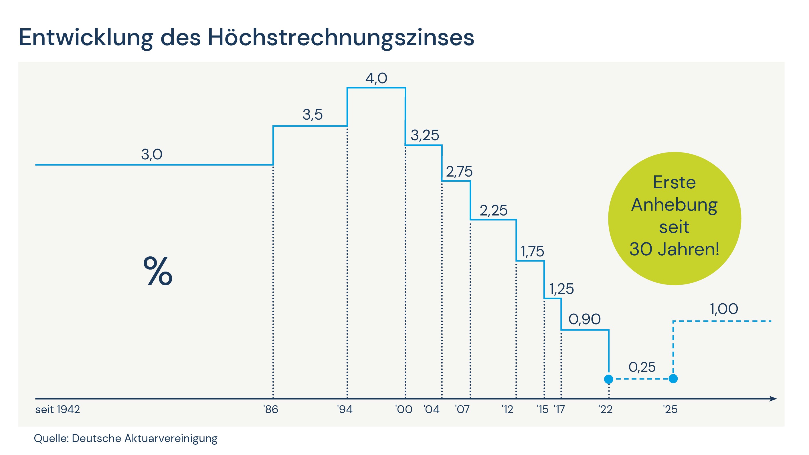Nachdem 24 Jahre lang der Höchstrechnungszins in der Lebensversicherung in Deutschland nur eine negative Entwicklung kannte, ist es so weit: Das Bundesministerium für Finanzen (BMF) hat eine Anhebung des Höchstrechnungszinses zum 1. Januar 2025 angekündigt. Der Rechnungszins liegt aktuell bei 0,25 Prozent und soll nun auf 1 Prozent angehoben werden. Diese Anhebung wirkt sich positiv auf die Kalkulation der Lebensversicherungsprodukte, da Versicherer ihren Kundinnen und Kunden dadurch bei sonst gleichbleibenden Faktoren eine höhere Garantierente bieten können. Was das konkret bedeutet und warum es sich lohnen kann, dennoch bereits jetzt deine Altersvorsorge und/oder Einkommenssicherung anzugehen, haben wir für dich zusammengefasst.