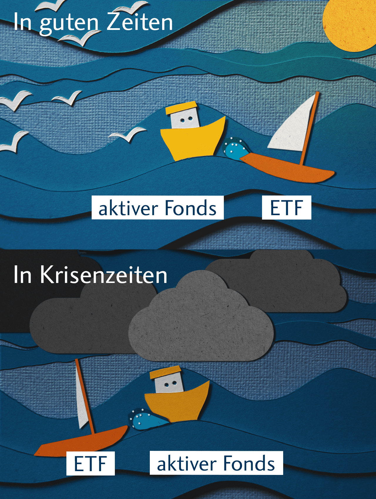 Aktive Fonds sind hier eher die Motorboote mit Kapitän, besonders stark in schwierigen Gewässern, also bei ineffizienten Märkten oder im Fall von Krisen. Hier kann der Fondsmanager versuchen, das Portfolio geschickt umzuverteilen. In diesen Zeiten erzielen empfehlenswerte aktive Fonds sogar eine Outperformance, also nach fondsinternen Kosten, eine Überrendite im Vergleich zum Index. Die etwas höheren Ausgaben, die fürs aktive Managen anfallen, können somit schnell wieder drin sein! Unser Tipp: Die Mischung macht’s!